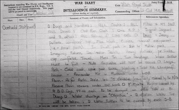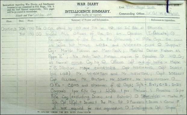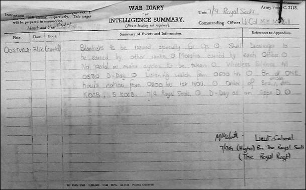 WAR DIARY: 7th/9th (Highlanders) Battalion The Royal Scots. Written during operations when I was the Battalion's Intelligence Officer, then aged 23 years, these accounts were countersigned by the Commanding Officer and sent by dispatch rider to 155 Infantry Brigade Headquarters and then forwarded to the Headquarters of 52nd Scottish Division. Embarking on 16th and 17th October 1944 at Southampton with our transport boarding at Tilbury, we landed at the recently liberated Ostend and assembled in Waergeham, Belgium (a small town a dozen or so miles from the French frontier). Now under the command of the Canadian II Corps the battalion was ordered to concentrate in the area of Oostveldt, Holland, preparatory to crossing The Scheldt to liberate the Island of Walcheren. The War Diary records the Battalion’s move from Oostveldt to Breskens where we embarked on Landing Craft Assault (LTA) boats to cross The Scheldt, subsequent landing on the assault beach at Flushing. They also record the attack on the German Headquarters in Flushing where 50 Germans were killed and 600 prisoners taken including Oberst Reinhart the German commander; and forcing the surrender in Middelburg of General Daser, Commander 70th German Infantry Division and Fortress Walcheren, with 2000 of his men. |