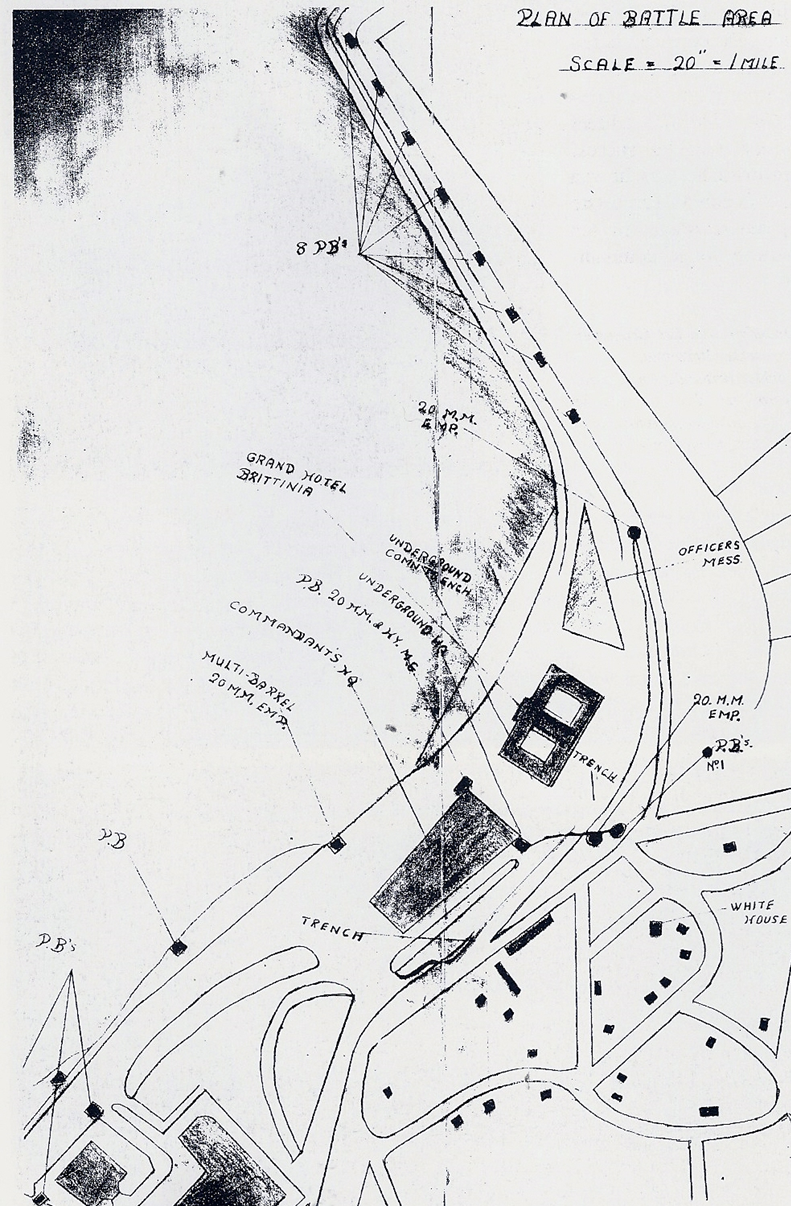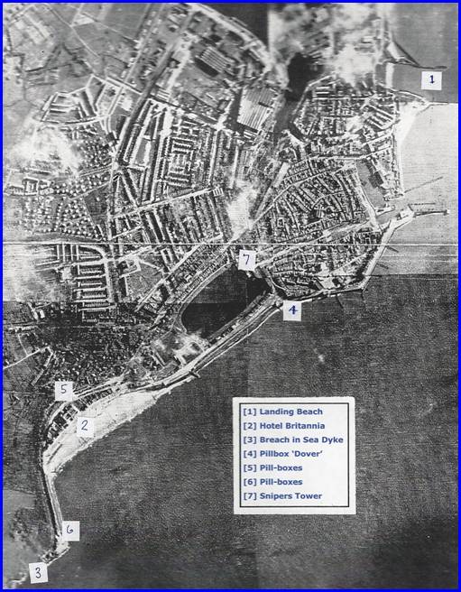 This view of Flushing clearly demonstrates the immense facility of aerial photography as an aid to briefing officers, non-commissioned officers and men preparing to assault an important enemy position. It graphically shows the location where our Assault Landing Craft had beached [1] and visually relates this to the Battalion's objective of the German Garrison Headquarters of Flushing located in the Hotel Britannia [2] being the centre of a heavily defended stronghold of concrete positions. It pin-points the nest of pillboxes north-east of our objective [5], that have to dealt with before attacking the main position. The visual scope of the aerial view relates how near to our objective was the gap [3] where the sea water from the Scheldt Estuary came flooding into Flushing, breached by the RAF prior to our landing. The sea water was tidal and could reach waist high and sometimes reaching up to the chest. Although the aerial photograph cannot show the depth of the flooding, information from the Dutch Resistance led to a decision to wear Mae-West lifebelts, despite their disadvantage during the assault. It will be seen from the aerial photograph that our capture of the objective would only be complete when the eight pillboxes on the sea dyke north-west of the Hotel Britannia [6] had been captured and our patrols had reached the sea wall gap [3] and visual contact with the Royal Marine Commandos had been made across the gap. The aerial pin-points the site of a key pillbox, code-named 'Dover' [4], covering the beach and sea-frontage area of the Hotel Britannia; and the Water-tower, code-named 'Snipers Tower' [7], useful as a point of reference during our night advance but possibly occupied by snipers and to be dealt on our way to the forming-up position where we will launch the attack.