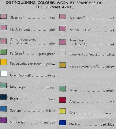 Enemy identification is made through the colour patches they wear, indicating arm of service. The panel below shows the colour distinctions. As infantry we expected to confront greenish uniforms with the white patches of the infantry (grenadiers) or green patches of Panzer grenadiers, and/or the pink patches of armoured personnel when attacked by German 'battle groups' of infantry and/or artillery and tanks. If other colour patches were identified, they had to be reported. For example the blue of support troops, red of artillery (possibly forward observation men), black of engineers, the lemon of signallers, maroon of smoke troops. If they were in the forward areas that was important intelligence.