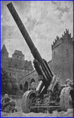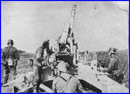 The German Attack A German attack can be anticipated after a period of active patrolling on our front, usually by fighting patrols of ten men prodding our defences looking for a weak point. If found, will then attack in strength almost at once. If no obvious weakness found, they will attack at several points and reinforce wherever they are successful. They believe success in attack is to win the initial fire-fight. They tend to concentrate maximum fire support of all their weapons on a narrow front, of light and heavy infantry guns, divisional artillery, SP assault guns and smoke mortars. Once they have penetrated, power is delegated to forward troops to take the initiative and drive the assault forward, their flanks will be guarded by artillery and anti-tank fire and screened by smoke. As the first wave pushes on, it will be followed by successive waves to widen the gap and then motorised troops and/or tanks can be expected. Points to look for in an attack: (1) MG and mortar groups of 2 to 3, second-in-command carrying tommy-gun. (2) Ranging rounds by their 8cm mortars. (3) Pronounced flash and loud report of infantry artillery. (4) Platoons moving 'one-up', 'two-up' or 'three-up'. (5) Sections advancing in single file and MG42s firing through the gaps German Artillery German Artillery is a separate arm of the service distinguished by the red colour piping on shoulder straps. Each Grenadier regiment has its own artillery of light and heavy infantry guns and manned by infantrymen wearing white piping on their shoulder-straps. These guns deployed much further forward than normal field artilleryas they are short-range. German equivalent of our 25-Pounder is 10.5cm gun-howitzer. The calibre is slightly larger (4.14ins) and shell heavier (33lbs). Range is 11,670 yards but with muzzle-brake (as for 25-Pounder) can range up to 13,400 yards.