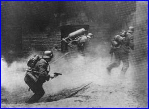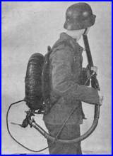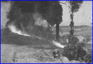 The more powerful Flamethrower Tanks of the Panzer Grenadier units carry 2 tanks of 35 gallons and have a range of about 40 yards and use spray bursts of 3 to 4 minutes.