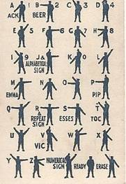 The signaller holds the flags arms extended in various positions to signal different letters and figures. The signal letter 'J' also indicates 'alphabetical letters follow'. There are special flag positions to indicate 'numerical signals follow' and an 'erase' signal. |