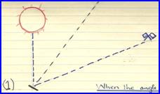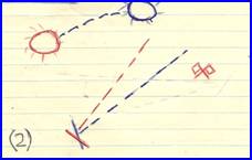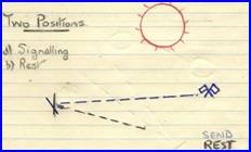 when an unsilvered spot in the centre of the signalling mirror causes a small shadow-spot to be thrown on to the vane enabling the signaller to accurately site on to the distant station. The first rough sketch (left) from my signal notes of 1940 indicate the two positions of the signalling mirror: when perdendicular it is reflecting signals to the distant station; when the key is released the suns rays are deflected away from the station. |