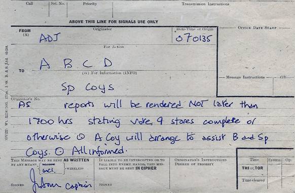 below Message received from Brigade HQ, delivered by the Signals Office to the Adjutant.