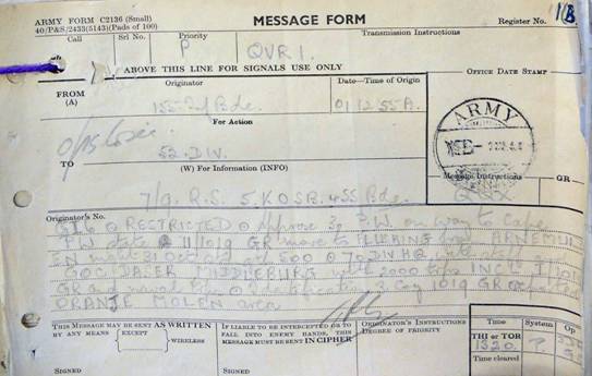 This is a copy of an actual message sent by the Brigade Major HQ 155 Infantry Brigade to HQ 52 (Lowland) Division, copied to the Bn Headquarters of 7th/9th Royal Scots, 5KOSB and the HQ 4th Special Service Brigade, on the first day of the 155 Brigade's assault landing at Flushing reporting intelligence gained from interrogating P.o.Ws which disclosed the movement of reserve forces to reinforce the Flushing Garrison. [See page 34 for wording of message.] In the top line of the message form the priority P indicates it is to be transmitted and handled by signals offices as 'Important'. Other prefixes: D Deferred [messages of minor importance]; when no indication used [routine messages]; P Important [used by any Officer for above ordinary routine messages, and instructions may be added such as 'To await arrival']; OP Immediate [used by Battalion Commanders or Senior Staff Officers for messages of special importance]; O Emergency [Commanders and Senior Staff Officers for messages of the utmost importance having a direct bearing on operations]; OU Most Immediate [Commander-in-Chief or his Chief Staff Officer only].